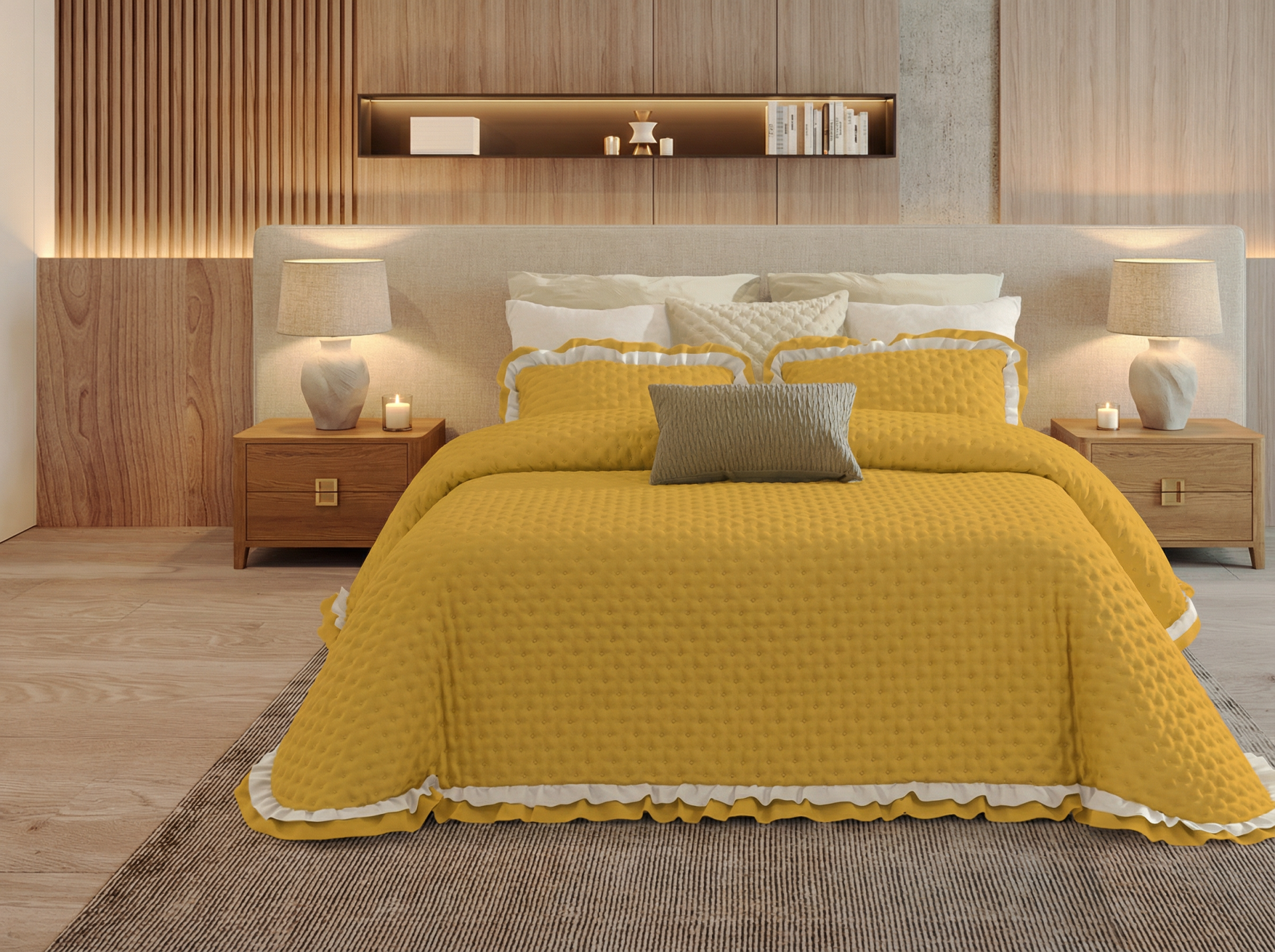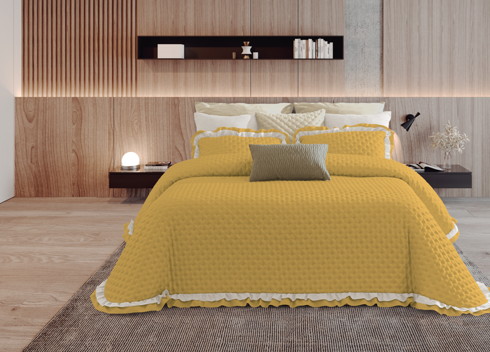 Home Colchas e Edredões Colcha Al-LinenF Colcha Al-LinenF 2 unidades em stock | SKU: C-LinenFF Cor Amarelo/Pérola 74,90 € Desconto de %. Comprar Contactar Adicionar à wishlist Apresentamos a nossa colcha com design trabalhado, um produto único que combina elegância, simplicidade, glamour e modernidade. Os detalhes de folhos adicionam um toque de sofisticação, transformando este item em um elemento decorativo de destaque no seu quarto. Medidas Casal: 1 x Colcha 250x270 cm 2 x Almofadas cheias 40x60 cm Composição: 100% Poliéster Fabricado em PORTUGAL Partilhar