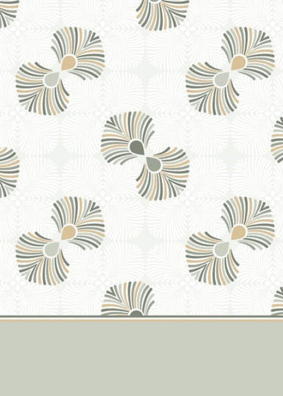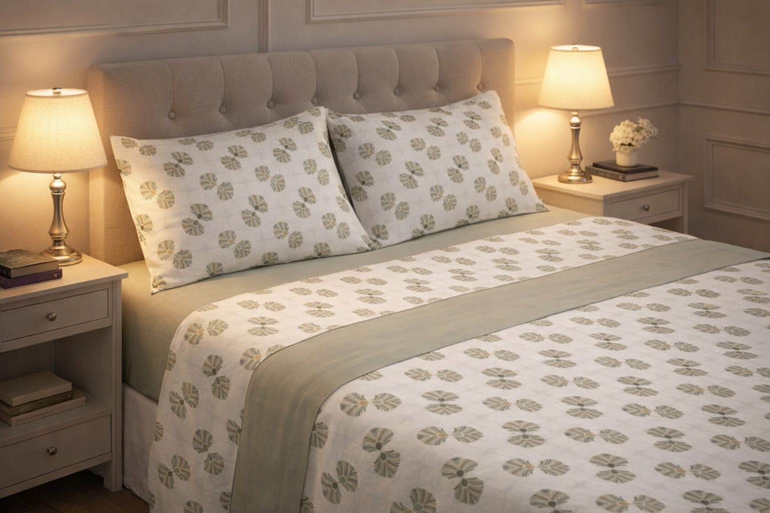 Roupa de cama com padrão floral bege e verde, candeeiros iluminam cabeceira estofada